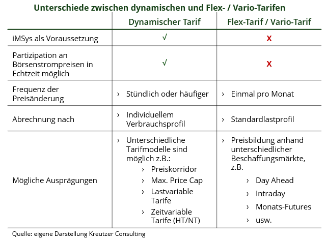 Aktuell ist in den Vergleichsportalen zu beobachten, dass dynamische Stromtarife oft die vorderen Plätze der Rankings belegen. Um einen Preisvergleich zu ermöglichen, wird dabei im ersten Monat ein Fixpreis mit einer einmonatigen Preisgarantie angeboten bevor in den folgenden Monaten der Arbeitspreis stündlich in Abhängigkeit der Day Ahead-Preise variiert. Damit stellen diese Tarifvarianten einen Mix aus Flex-Tarif / Vario-Tarif im ersten Monat und dynamischem Tarif in den Folgemonaten dar, was die Vergleichbarkeit der Tarife nochmals erschwert. Während reine dynamische Tarife eine stündliche oder häufigere Preisänderung aufweisen und nach individuellem Verbrauchsprofil abgerechnet werden, ändert sich der Preis bei Flex-Tarifen einmal im Monat und die Abrechnung findet wie bei normalen Stromtarifen nach dem Standardlastprofil statt. Des Weiteren unterscheiden sich dynamische Tarife von Flextarifen in der Notwendigkeit eines Smart Meters.