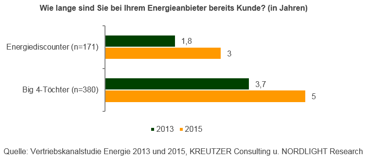 So verlängerte sich die Verweildauer der im Rahmen der Vertriebskanalstudie Energie 2015 befragten Energiekunden der Energiediscounter – wohl auch aufgrund des Ausscheidens der FlexStrom-Gruppe aus dem Markt – um 1,2 auf drei Jahre. Die Big 4-Töchter profitierten in ähnlichem Maße.