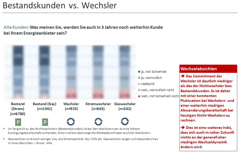 Kundenbindung Abschließend werfen wir einen Blick auf die Zufriedenheit mit den Vertriebskanälen und Anbietern und betrachten die Wahrscheinlichkeiten, dass Kunden beim bisherigen oder neuen Energieanbieter bleiben und einen Vertriebskanal zukünftig erneut nutzen. |