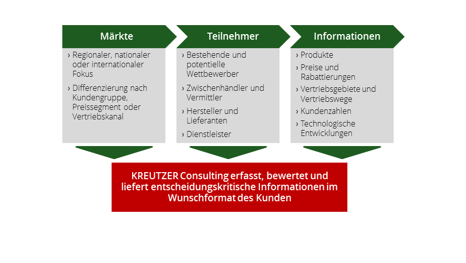 KREUTZER Consulting bietet Ihnen individuelle Informationsdienstleistungen, die Ihnen helfen, den Wettbewerb stets im Auge zu behalten und kritische Entwicklungen frühzeitig zu erkennen und adäquat darauf zu reagieren. Die schnelle und flexible Beantwortung von Ad hoc-Fragestellungen oder die Erstellung detaillierter Wettbewerberprofile runden unser Informationsdienstleistungsportfolio ab.