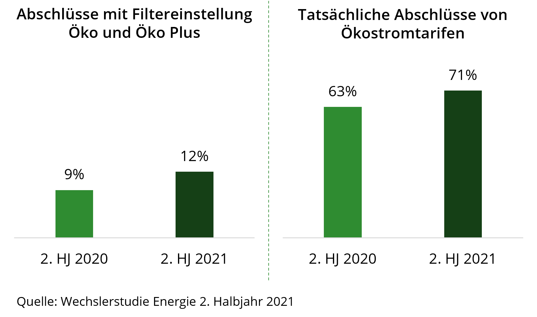 Dass ein Großteil der Verbraucher zusätzlich im Rahmen der Standardeinstellungen von einem Ökostrom-Tarif überzeugt wird, illustriert der Anstieg der Abschlussquote von Ökostromtarifen um ca. acht Prozentpunkte auf 71 Prozent im zweiten Halbjahr 2021.
