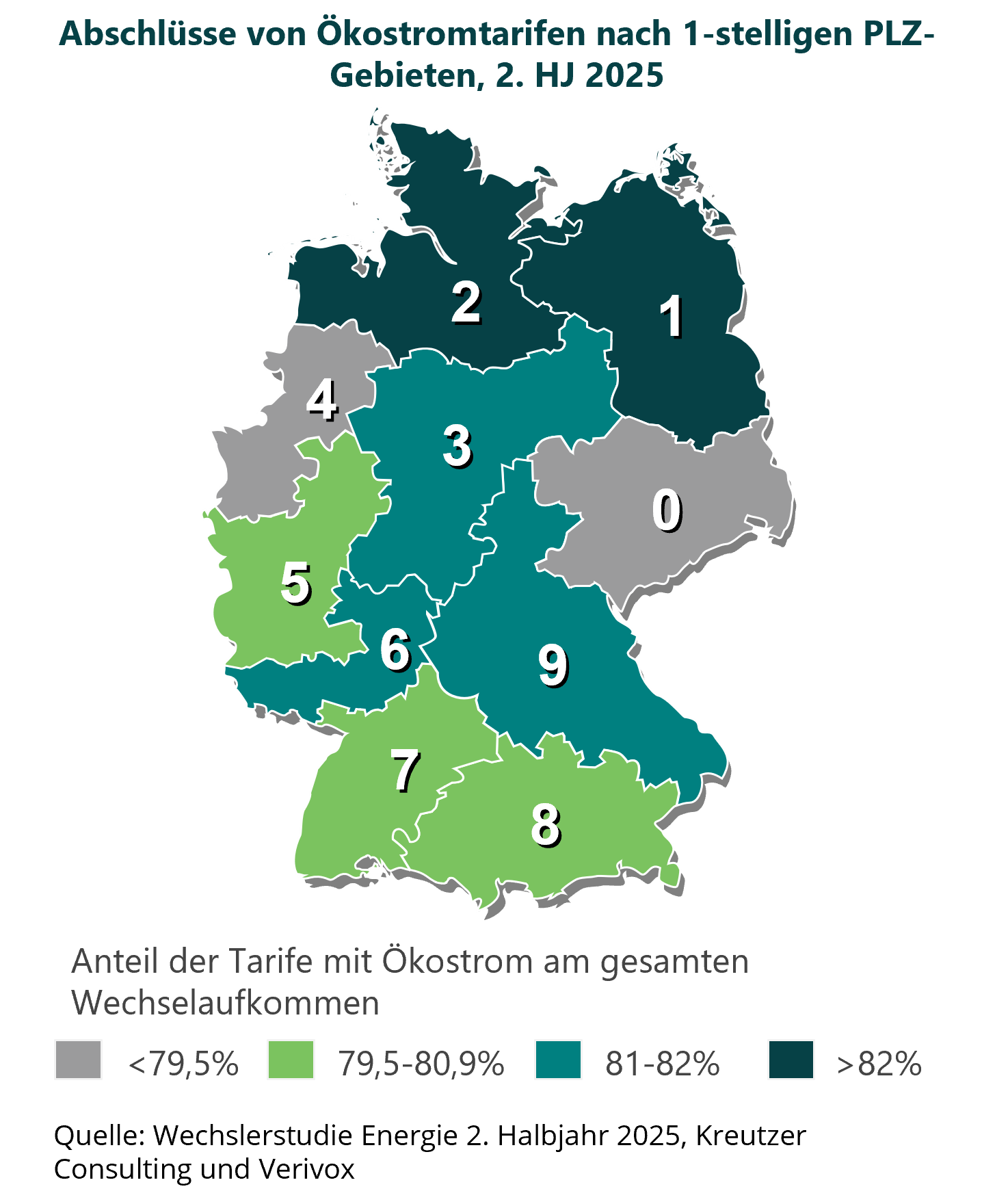 Neben der klassischen Auswertung zentraler Markt- und Tarifkennzahlen legt die Wechslerstudie Energie im zweiten Halbjahr 2025 einen besonderen Fokus auf regionale Unterschiede im Wechselverhalten. Die Analyse der regionalen Ökostrom-Präferenzen zeigt bspw. ein Nord-Süd-Gefälle. In den nördlichen Postleitzahlregionen ist die Ökostrompräferenz leicht höher ausgeprägt als im Süden Deutschlands. So weisen die PLZ-Gebiete 1 und 2 mit 82,4 % die höchste Ökostromabschlussquote auf, wohingegen in den PLZ-Gebieten 7 und 8 ein niedrigerer Anteil verzeichnet wurde.
