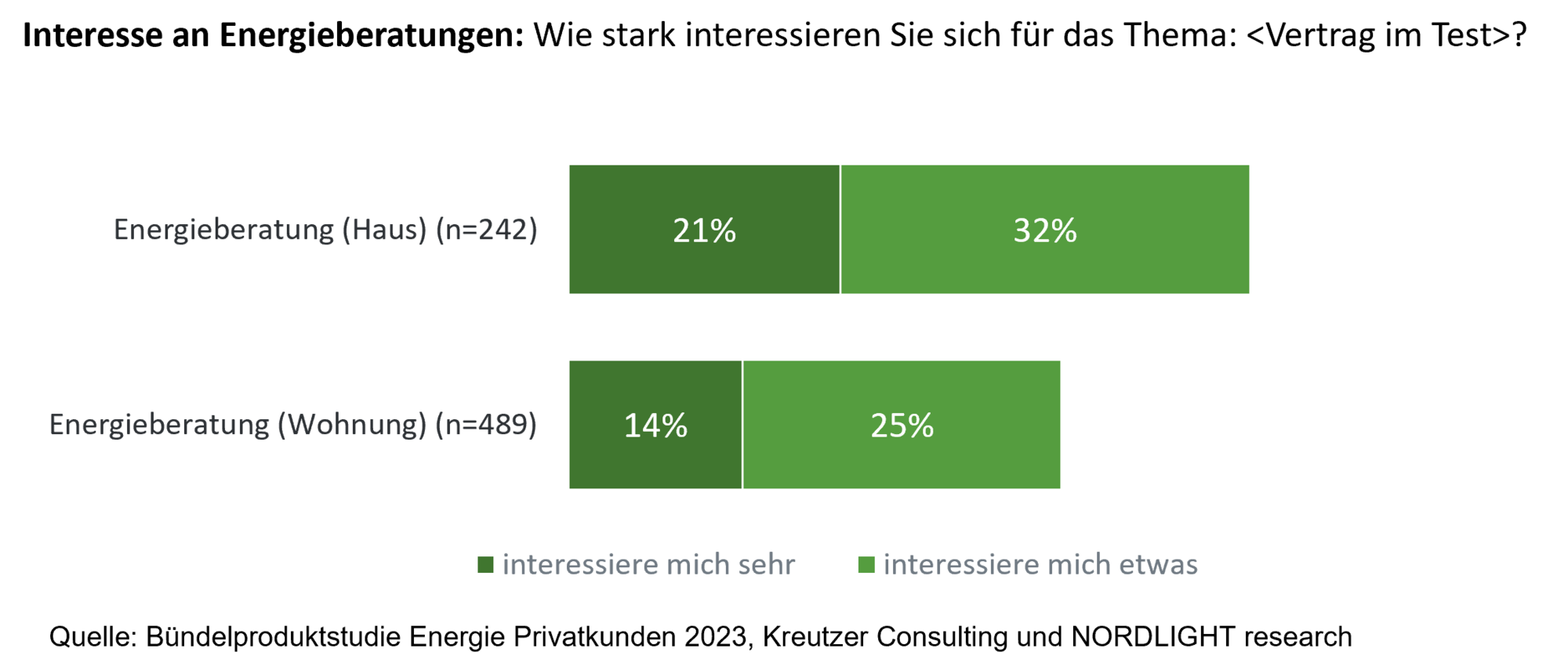 53 Prozent der Verbraucher zeigen hohes Interesse an einer Energieberatung im eigenen Haus. Dass es Energieanbieter gibt, die die Energieberatung im Bündel mit dem Energievertrag anbieten, wissen jedoch nur 23 Prozent und noch weniger der Verbraucher haben bereits eine Energieberatung von ihrem Energieversorger in Anspruch genommen. Dies zeigen die Ergebnisse der im Mai erschienenen Bündelproduktstudie Energie Privatkunden 2023 von Kreutzer Consulting und NORDLIGHT research, bei der über 5.000 Energiekunden inkl. rund 700 Hardware- und Tarifbündelkunden befragt wurden.