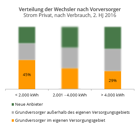 Rund 45 Prozent der Geringverbraucher, die weniger als 2.000 kWh Strom pro Jahr verbrauchen, verlassen beim Versorgerwechsel den lokalen Grundversorger. Bei den Großverbrauchern sind es dagegen weniger als ein Drittel. 52 Prozent der Geringverbraucher wechseln aber anschließend zu anderen Grundversorgern in deren externen Vertriebsgebieten, während es bei Großverbrauchern mit mehr als 4.000 kWh Jahresverbrauch nur 29 Prozent sind. Dies geht aus der aktuellen Ausgabe der Wechslerstudie Energie 2. HJ 2016 hervor, die als Schwerpunktthema den Zusammenhang zwischen der Höhe des jährlichen Strom- und Gasverbrauchs und dem Wechselverhalten der Verbraucher untersucht.